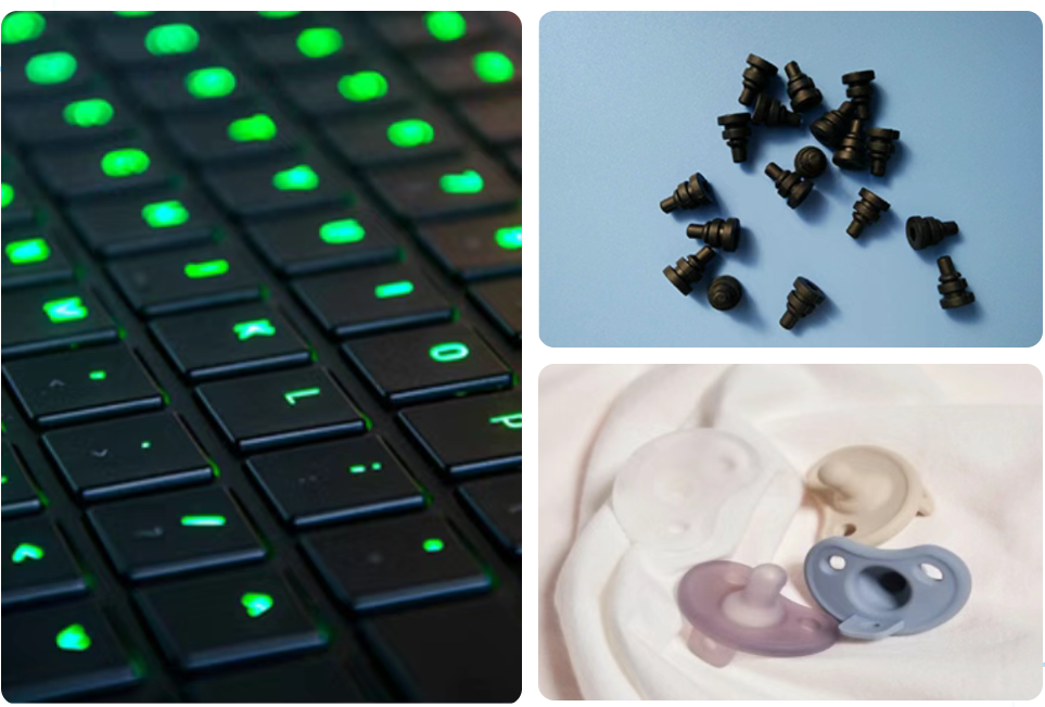 Today, LSR is widely used in medical devices, food-contact materials, automotive parts, electronics, electrical applications, and aerospace.